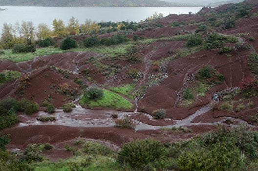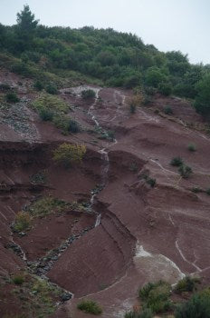 Das Wasser war in der Nacht knapp einen halben Meter angestiegen. Überall bildeten sich kleine Wasserfälle in den Bergen, die in Rinnsalen am Bergfuß als kleine Bäche im See mündeten und ihn rot verfärbten. Fangwetter!!