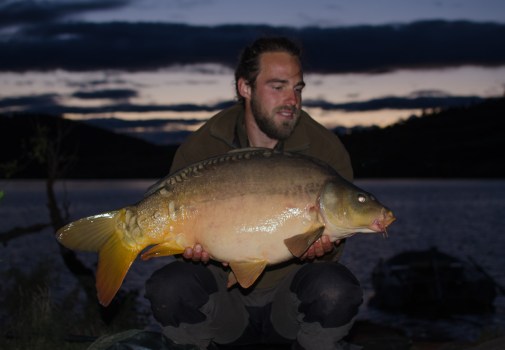 Es war so etwa gegen vier am Morgen als sich plötzlich einer meiner Bissanzeiger von der Melodie der “Windpiepser” abhob und zu einem Dauerton wurde. “Auch das noch” – dachte ich und zog mir meine Regenjacke über, die mich zumindest etwas vor diesem Teufelswetter schützen sollte. Ich pumpte den Fisch irgendwie vom Ufer heran und kescherte einen kleine Spiegler. Etwas genervt von der Größe des Fisches, der mich bei dieser Weltuntergangsstimmung aus dem Zelt klingelte, beförderte ich ihn direkt wieder zurück ins Wasser um mich schnell wieder ins geschützte, trockene Zelt zu verziehen.