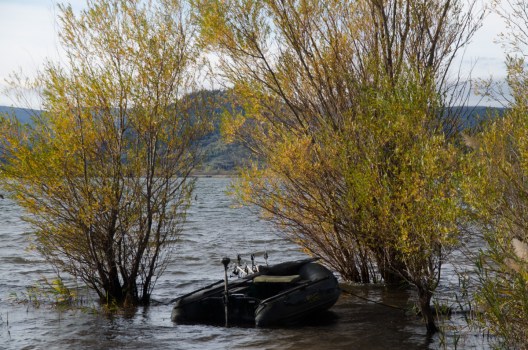 Am Vormittag kam auch Clemens mit gepacktem Auto an meine Stelle, an der auch ich gerade mit dem zusammenpacken beschäftigt war. Er war noch eine Nacht länger am letzten Spot geblieben, ohne Erfolg. Wir berieten uns kurz und entschlossen noch einmal gemeinsam einen Bereich zu versuchen, den wir nur mit den Booten erreichen konnten. Wir parkten die Autos auf einem belebten Parkplatz um diese in Sicherheit zu wissen und stießen in See. Um effektiver zu fischen, teilten wir uns auf und angelten in einem Abstand von circa 200 Meter in unterschiedlichen Gewässerbereichen. Ich entschied mich erneut für eine flache, krautige Bucht, Clemens fischte tiefer und legte die Ruten bis auf circa 10 Meter. Die Stellen wählten wir geschützt unter Obacht auf die vorhergesagte Tiefdruckfront die ordentlich Wind, Regen aber auch mildere Temperaturen bringen sollte.