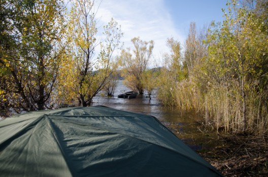 Clemens und ich beschlossen uns mal wieder zusammen zusetzen, um unserer vorerst letzte Session hier im Süden gemeinsam zu verbringen. Unsere Wahl fiel auf eine Stelle mitten im Wind gelegen, die wir sogar mit dem Auto erreichen konnten. Die Zelte waren durch die Bäume vom Wetter geschützt und somit in Sicherheit. Vor allem den Wind hatte ich am See immer genaustens im Blick, um nicht plötzlich eine böse Überraschung zu erleben. Die Bedingungen waren alles andere als angenehm: Tagestemperaturen von maximal 10 Grad und der dazu kalte- auflandige Nord-West Wind machten uns fast handlungsunfähig und ließen uns einfach ausharren. Immer mit der Hoffnung, dass die Montagen noch an ihren Plätzen lägen, warteten wir auf einen Biss. Vier Nächte dauerte es, bis ich die Hoffnung in diesen Platz verlor und die Sachen packte um es für ein oder zwei Nächte in einem deutlich flacheren Seeteil zu versuchen.